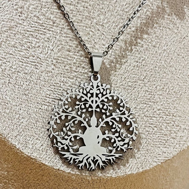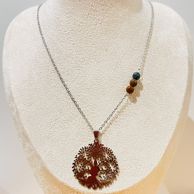 Il est sublimé par un pendentif Arbre de Vie au style méditation, évoquant l’ancrage, l’harmonie et la connexion à soi.