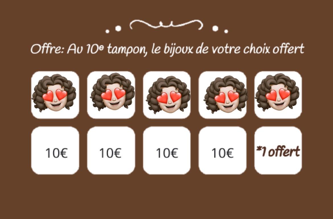 - Au 10ᵉ tampon, recevez un bijou de votre choix offert, avec les frais de livraison inclus.