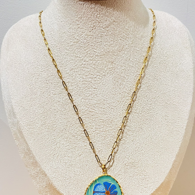 Ce collier est composé d’une chaîne en acier inoxydable et d’un pendentif rond orné d’une magnifique fleur bleue, délicatement entourée de vert. Un bijou lumineux, frais et élégant, idéal pour apporter une touche de couleur à toutes tes tenues.