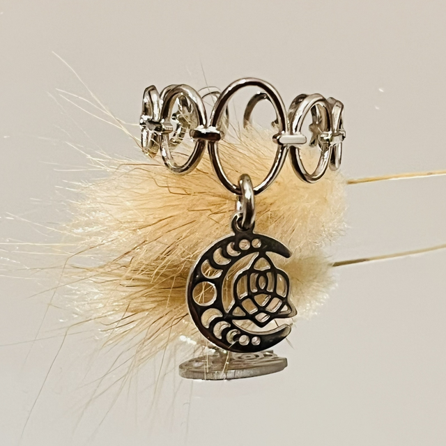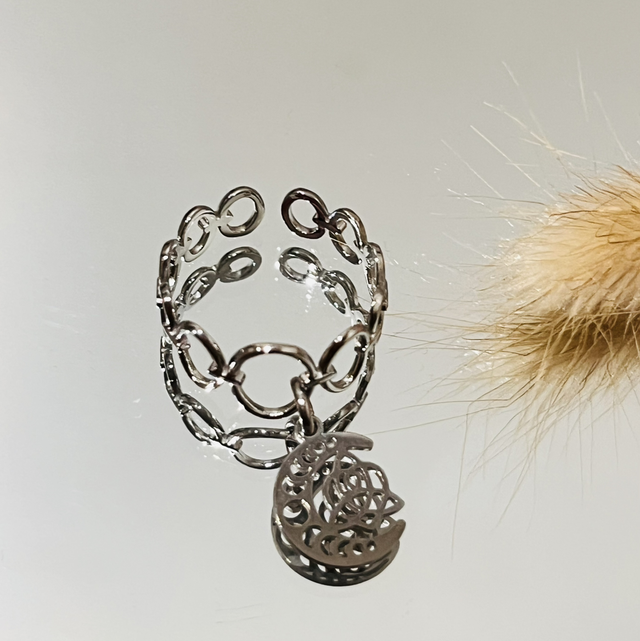 Cette bague réglable au style délicat et symbolique associe une chaîne fine en acier inoxydable à un pendentif.