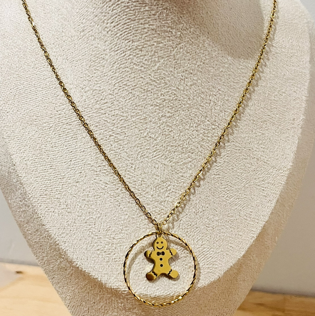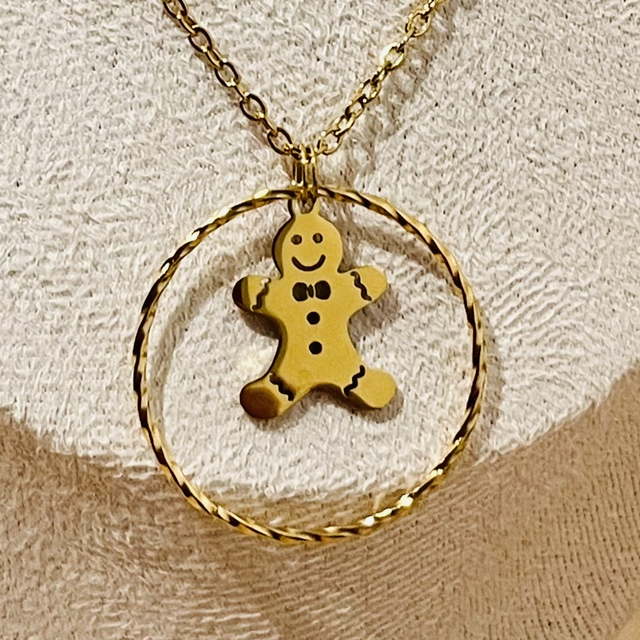 Ce joli pendentif “bonhomme pain d’épices” doré est suspendu à un anneau texturé.