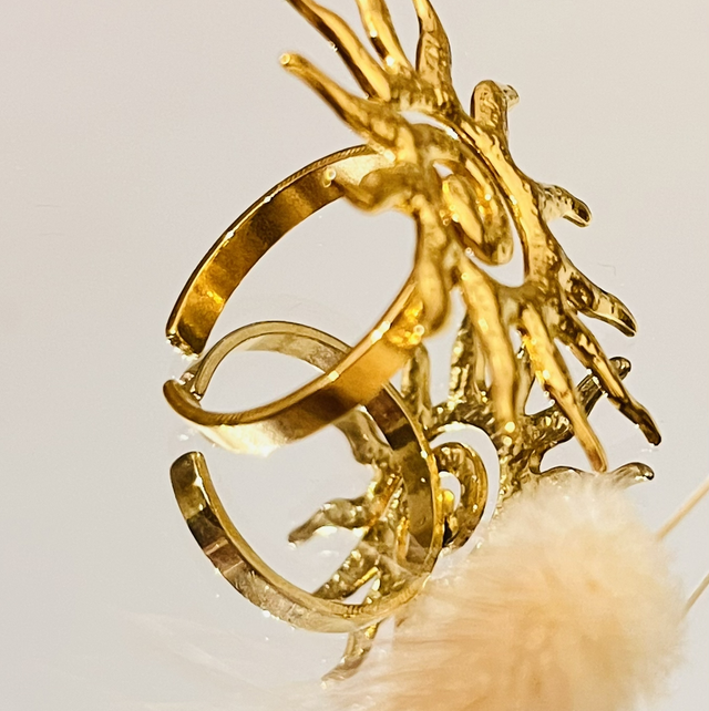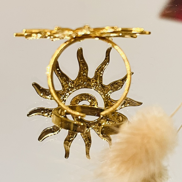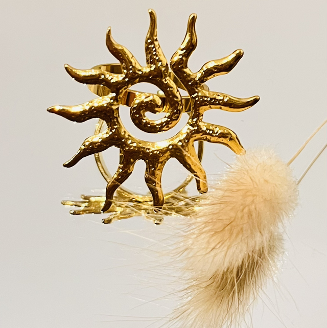 Rayonnante et pleine de caractère, cette bague Soleil en acier inoxydable illumine la main avec son motif solaire sculpté, symbole de lumière, d’énergie et de vitalité.