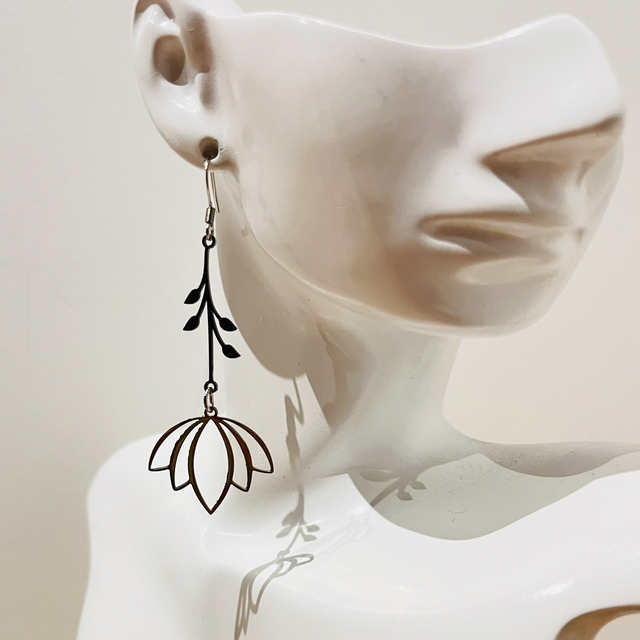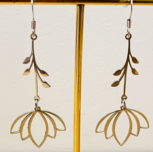 Élégantes et aériennes, ces boucles d’oreilles pendantes associent un motif végétal fin à une fleur de lotus stylisée, symbole de pureté et d’harmonie. Leur design tout en légèreté apporte un joli mouvement et sublime le port de tête.