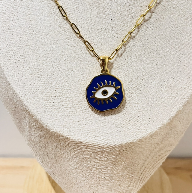 Protégez votre style avec élégance grâce à ce collier en acier inoxydable. Sa chaîne de 39 cm, ajustable grâce à une rallonge de 4 cm, permet de le porter court ou légèrement plus long, selon vos envies. Le pendentif œil protecteur se distingue par un fond bleu profond, un iris bleu et un intérieur blanc, entouré de cils délicats, symbolisant protection et style. Léger, résistant et facile à porter au quotidien, ce collier apportera une touche unique à toutes vos tenues.